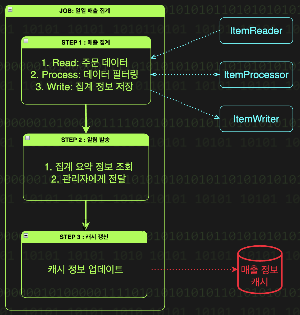 Step은 Job을 구성하는 실행 단위로 하나의 Job은 하나 이상의 Step으로 구성된다. 예를 들어 '일일 매출 집계' Job은 다음과 같은 Step들로 이뤄질 수 있다.