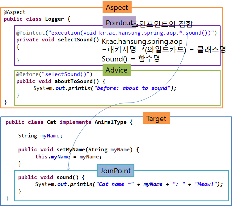- aspect: 한개 이상의 포인트컷과 어드바이스의 조합으로 만들어진 공통 기능 (트랜잭션, 로그 등)