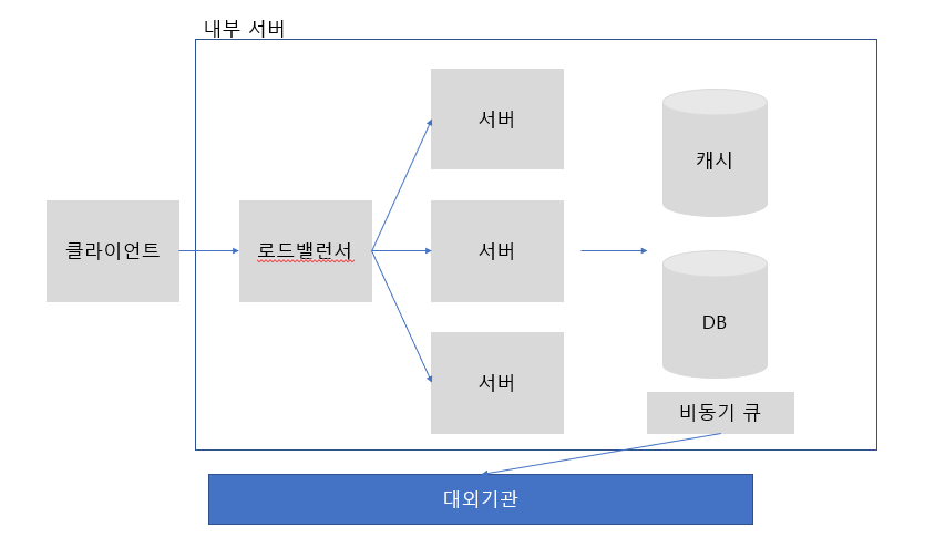 비동기 큐에 요청을 쌓으므로서, 대외기관과의 트랜잭션을 클라이언트 요청에서 제외 시킬 수 있음 (내 서버에 데이터에만 의존하게 됨)