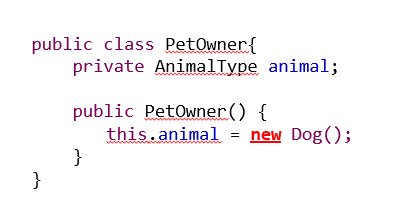 그림처럼 DI를 이용하지 않고 new를 사용하여 객체를 생성하게 되면 PetOwner와 Dog간 강한 결합이 생기게 되어 도그를 수정하면 PetOwner가 수정될 수 있다.