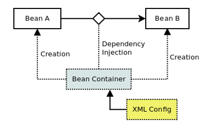 반면 다음과 같이 Bean Container를 이용하여 객체를 생성하고 의존성 주입을 시켜주면 결합이 강하지 않다는 장점이 생긴다. 이때 Bean Container는 XML로 이루어져 있다.
