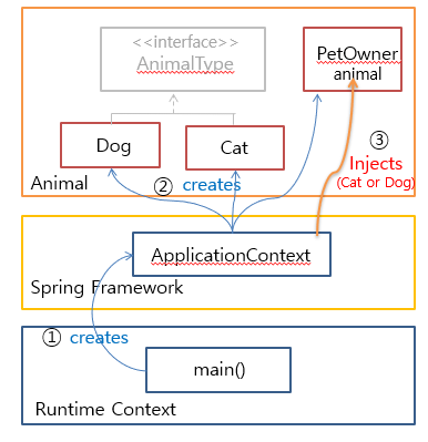 다음 그림처럼 메인함수에서는 ApplicationContext라는 BeanContainer를 생성하고 미리 작성된 xml에 따라 ApplicationContext는 Dog, Cat, PetOwner라는 객체를 생성하고 Dog, Cat을 PetOwner에 의존성 주입한다. 스프링은 new방식 대신 DI방식을 권장한다.