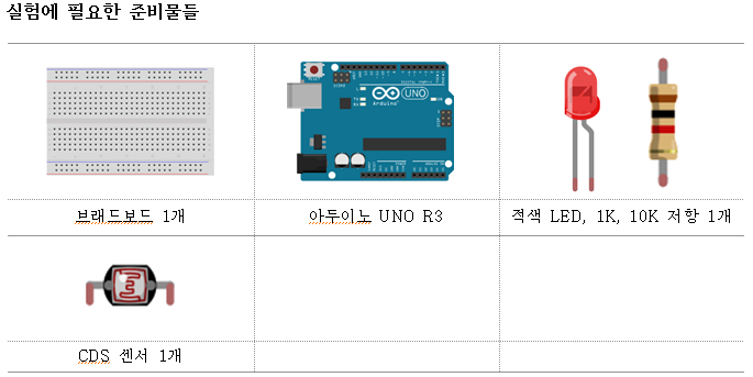 조도센서를 통한 LED ON/OFF실습에 필요한 사전준비물은 다음과 같다
