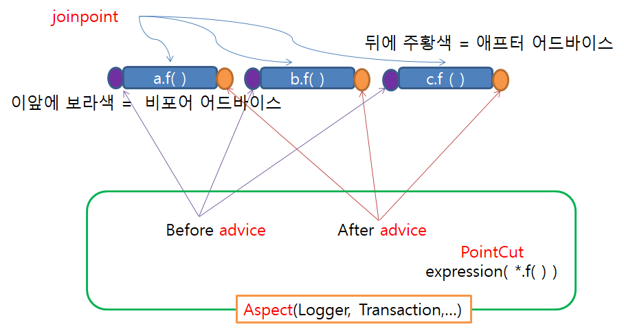 다음 그림처럼 a.f()가 실직적인 타겟이되는 joinpoint가 되고 그림 앞에 보라색, 주황색이 선처리 후처리를 담당하는 어드바이스가 된다. 어드바이스는 joinpoint는 Pointcut이 가리키게 된다