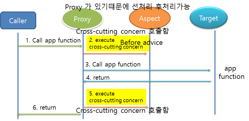 AOP는 다음 그림처럼 선처리, 후처리(런타임시 짜집기함)를 가능하게 지원하기 때문에 메인 Bean을 만드는 클래스를 따로 두고 로깅, 트랜잭션을 선처리 후처리로 다음과 같은 구조를 만드는 것이다.