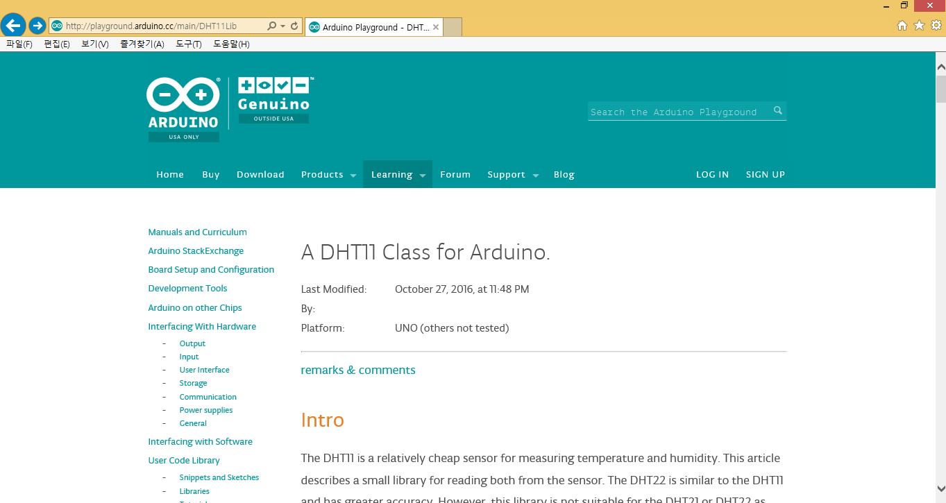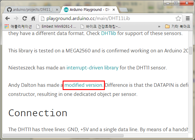 http://playground.arduino.cc/main/DHT11Lib 링크를 통해 라이브러리를 다운로드한다