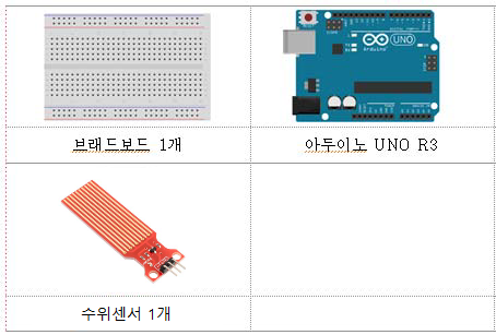 수위 측정 센서를 통해 물이 얼마나 찼는지 측정한다. 사전준비물은 다음과 같다