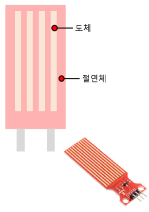 - 접촉식 수위센서 뿐만 아니라, 수분센서, 강우량 센서 등 액체의 직접적인 접촉에 의한 대부분의 센서들은 이와 같은 저항값에 따른 수분량을 파악함.