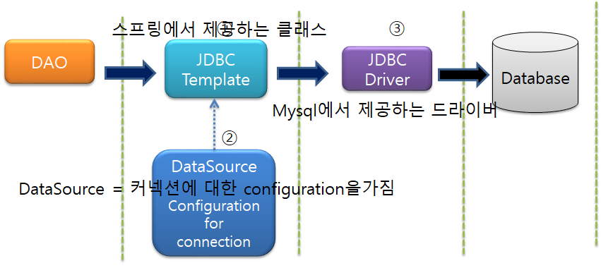 DB에 접근하기 위해 다음 그림과 같이 DAO는 JDBC Template에 이는 JDBC Driver를 통해 Database에 접근하고 DataSource를 이용하여 DB에 실질적으로 커넥션 한다.