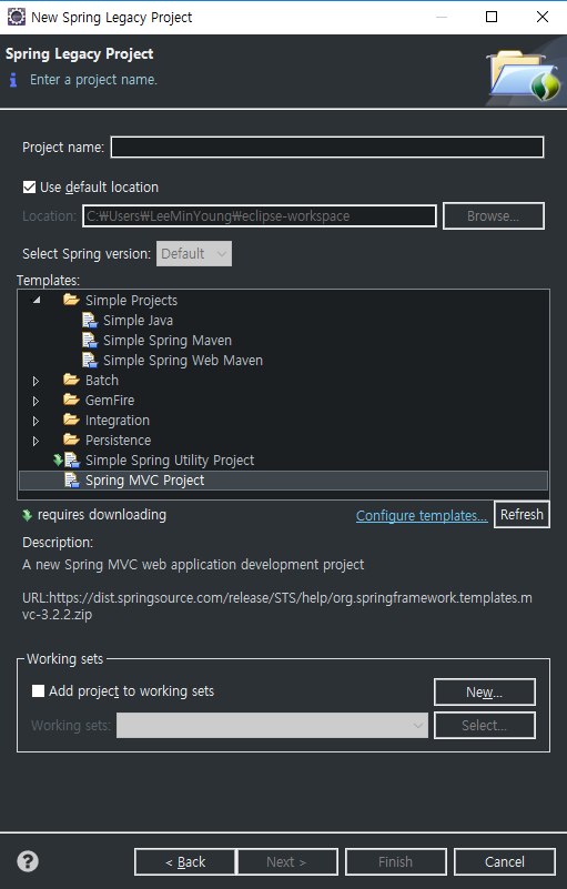 다음과 같이 Spring Legacy Project의 Spring MVC Project를 클릭하고 helloSpringMVC라는 프로젝트를 생성한다