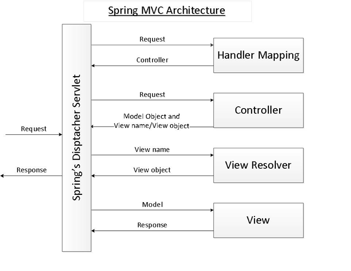 다음과 같은 spring MVC 아키텍처에서 우리는 controller와 view부분만 만들면 되며 나머지 부분은 스프링에서 제공한다. 사용자의 request가 들어올 경우 dispatcher servlet가 요청을 가로채고 handler Mapping에 전달한 후 컨트롤러로 요청이 전달하고 우리가 만든 컨트롤러에 의해 view 네임을 선택하면 view Resolver에 의해 view네임을 가진 jsp를 선택하게 된다.