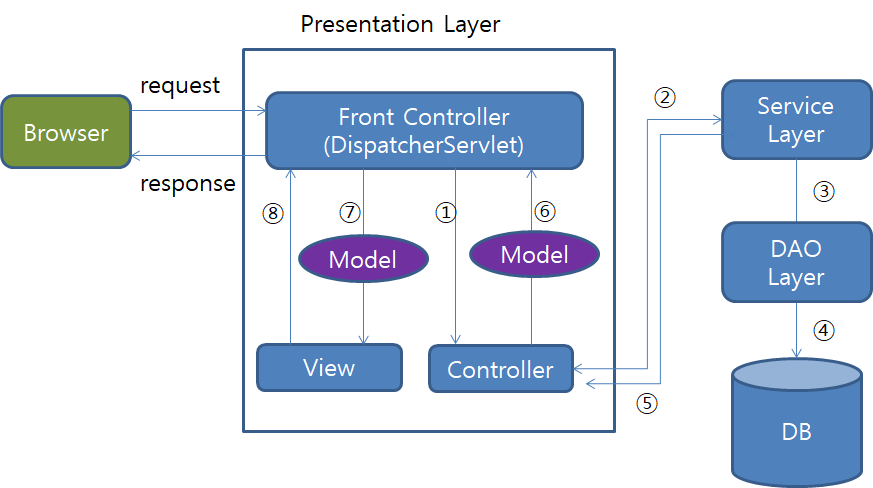 다음 그림과 같은 구조를 생성하기 위해 dao, model, service를 생성한다. 사용자의 요청이 들어오면 Dispatcher Servlet에서 이를 컨트롤러에 전달해주고 컨트롤러는 이에 맞는 서비스에게 전달하고 서비스는 DAO에게 DAO는 DB에 접근하고 모델을 통해 View로 사용자에게 response 하는 구조이다