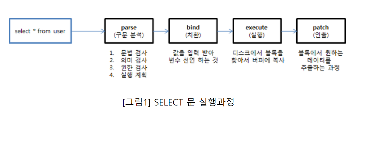 preparedStatement는 다음과 같이 4가지 단계로 이루어져있다. 이중 parse 부분을 컴파일한채로 캐시에 저장하고 데이터가 bind될때까지 기다린다 이후 patch부분까지 실행이 완료되고 sql을 재사용할때 parse를 다시 실행하지않고 캐시에 저장되어있는 부분을 가져다 나머지 3단계만 실행한다. 따라서 sql이 반복적일때 효율적이다.