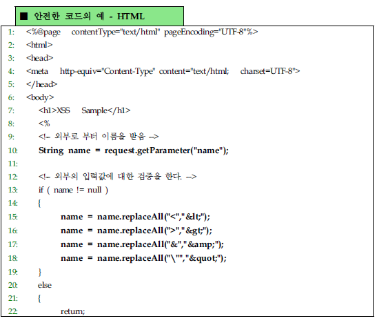 따라서 다음과 같이 replaceAll()메소드를 사용하여 <, >같은 스크립트 생성에 사용되는 문자열을 < > 같은 형태로 변경함으로써 스크립트 수행위험을 줄일 수 있다.