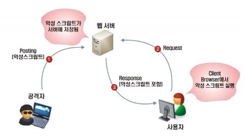 페이지에 악의적인 스크립트를 포함시켜 사용자 측에서 실행되게 유도할 수 있다. 다음 그림과 같이 악성 스크립트를 서버측에 저장하면 다른사용자는 악성스크립트가 포함된 페이지를 응답받고 정보유출이 될 수 있다.