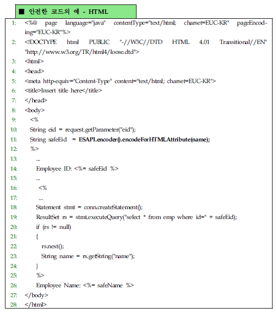 다음 예제의 경우 OSWASP에서 제공하는 보안 API를 사용하고 있다. 보안 API를 사용하면 특수 문자를 이용한 공격 스크립트와 같은 외부 입력 문자열을 이용한 공격을 차단할 수 있다.