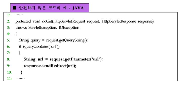 사용자로부터 입력되는 값을 외부사이트의 주소로 사용하여 자동으로 redirect 하는 경우 피싱 공격에 노출되는 취약점을 가질 수 있다.