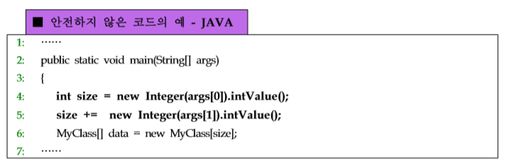 다음의 예제는 외부의 입력을 이용하여 동적으로 계산한 값을 배열의 크기(size)를 결정하는데 사용하고 있다. 만일 외부 입력으로부터 계산된 값이 오버플로우에 의해 음수값이 되면 배열의 크기가 음수가 되어 문제가 발생할 수 있다.