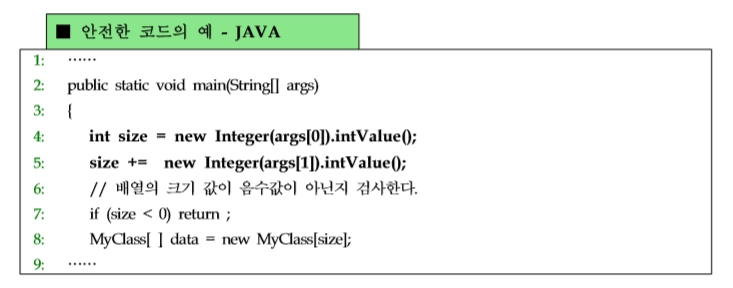 언어 별 정수타입의 범위를 확인하여 사용한다. 정수형 변수를 연산에 사용하는 경우 결과값의 범위를 체크하는 모듈을 사용한다. 특히 외부 입력값을 동적으로 할당하여 사용하는 경우 변수의 값 범위를 검사하여 적절한 범위내에 존재하는지 확인한다.