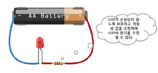 준비한 준비물의 회로를 다음과 같이 구성한다. LED와 1K저항을 연결하고 빨간선은 +를 의미 검은선은 GRN을 의미한다