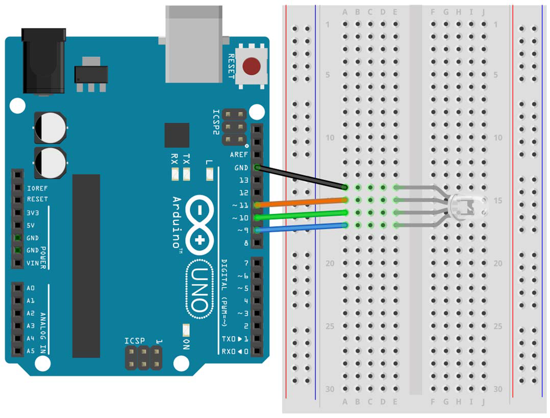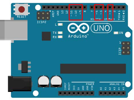 아두이노 우노 보드에서는 다음 그림과 같이 3, 5, 6, 9, 10, 11번 핀이 PWM 출력 기능을 제공함