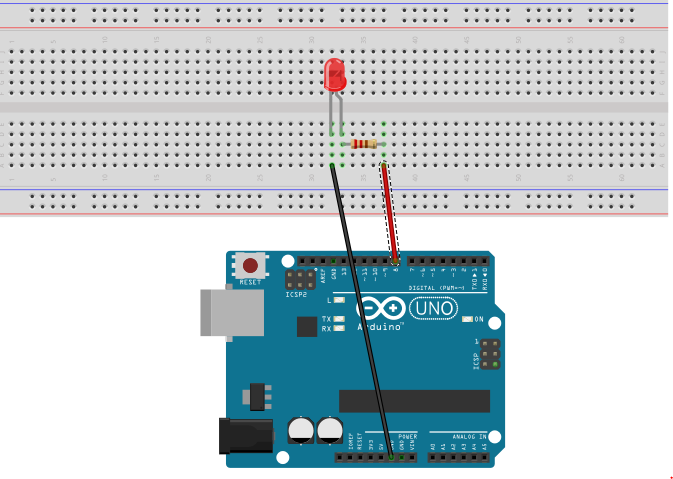 PWM이 무엇인지 알았다면 LED를 이용하여 실제 예제를 학습해보자. 다음 그림과 같이 브레드보드 1개, 아두이노 우노, LED 1개, 1K저항 1개를 사용하였다.