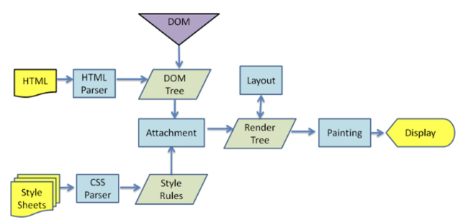 DOM은 다음과 같은 다음과 같은 workflow를 따른다. 즉 html를 읽어서 DOM 트리, CSS 트리를 만들고 DOM의 위치를 잡고 거기에 그리고 색을 채운다.