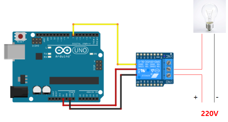 만약 다음 그림과 같이 연결되어있다면 평상시에는 NC와 COM이 연결되어있기 때문에 현재 NO, COM이 연결된 아래 그림은 전구에 불이 켜지지 않을 것이다 하지만 7번 핀에 전류가 흐를 경우 NO와 COM이 연결되므로 전구에 불이 켜질 것이다. 이처럼 낮은 전류로 높은 전류를 컨트롤하기 위해 릴레이를 사용한다