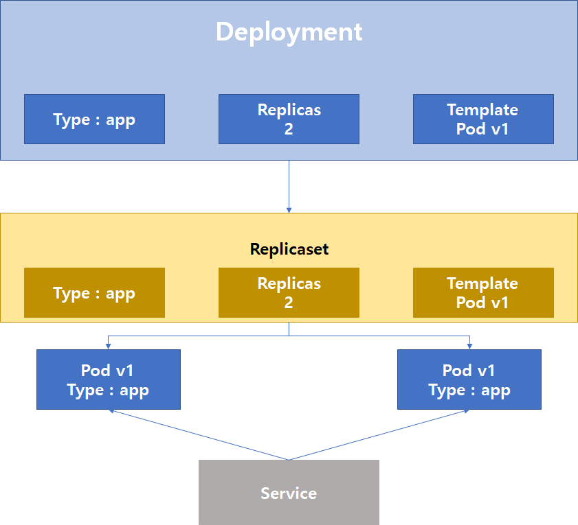 다음과 같은 구조로 이루어져있을때 Deployment의 pod v1을 v2로 수정하면 자동으로 Rolling Update가 된다(Rolling Update가 Default)