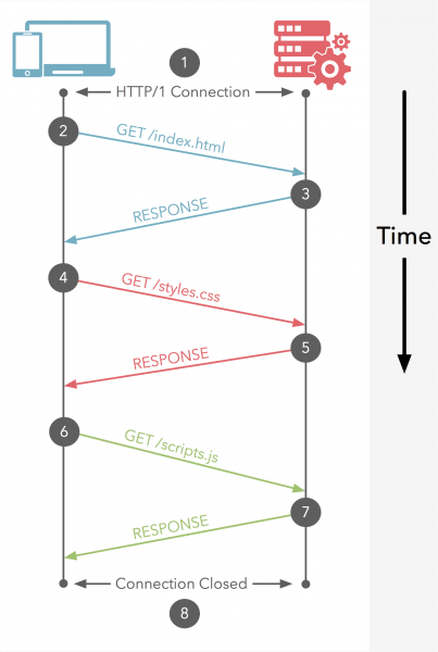 • HTTP는 그림과 같이 기본적으로 1번의 연결로 1개의 리소스를 요청할 수 있다. 따라서 동시 요청이 어렵고 느리다.